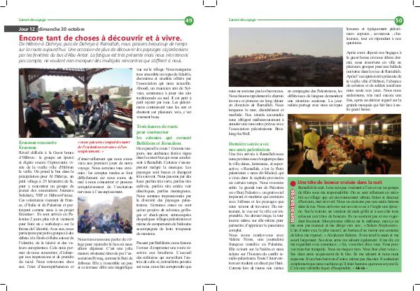 Ramallah la nuit. Je ne suis pas vraiment à l’ aise avec un groupe de filles sous ma responsabilité. On se sent tellement en sécurité au village que cet environnement urbain, béton et absence d’ horizon, met en éveil. Nous ne croisons pas une seule femme dans la rue. Nous arrivons sur un coin avec à l’ angle une épicerie. Sur le trottoir, un vendeur de maïs grillé et à son côté trois colosses aux têtes de boxeurs. Ils ne sourient pas et me regardent fixement. Mon premier réflexe est la méfiance, mais je ne me sens pas menacé et me dirige vers eux; « Salam Aleykoum ». L’ un d’ entre eux, le plus massif, un bestiau d’ au moins une centaine de kilos me répond; « Aleykoum Salam ». Il me tend la main et me sourit largement. Ses deux amis me saluent également. Il me dit, en me regardant avec assurance; « Ici, vous êtes chez vous. Vous pouvez marcher tranquile. Vous ne risquez rien. Vous êtes chez vous ». Ses deux amis acquiescent de la tête. Ils me saluent et nous nous séparons. Il ne cherchait rien d’ autre, même pas discuter. Il souhaitait simplement que nous sachions qu’ il était heureux que nous soyons là. C’ est une véritable leçon d’ hospitalité.- Alexis- temoignage