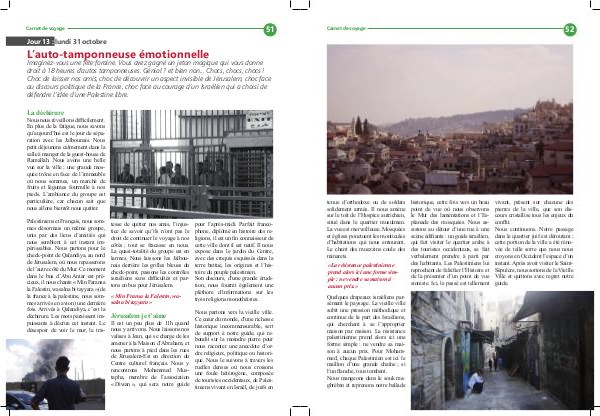 historique, cette fois vers un beau point de vue où nous observons le Mur des lamentations et l’ Esplanade des mosquées. Nous assistons au détour d’ une rue à une scène édifiante: un guide israélien, qui fait visiter le quartier arabe à des touristes occidentaux, se fait verbalement prendre à parti par des habitants. Les Palestiniens lui reprochent de falsifier l’ Histoire et de la présenter d’ un point de vue sioniste. Ici, le passé est tellement vivant, présent sur chacune des pierres de la ville, que son discours cristallise tous les enjeux du conflit. Nous continuons. Notre passage dans le quartier juif est déroutant; cette portion de la ville a été rénovée de telle sorte que nous nous croyons en Occident l’ espace d’ un instant. Après avoir visiter le Saint- Sépulcre, nous sortons de la Vieille Ville et quittons avec regret notre guide.