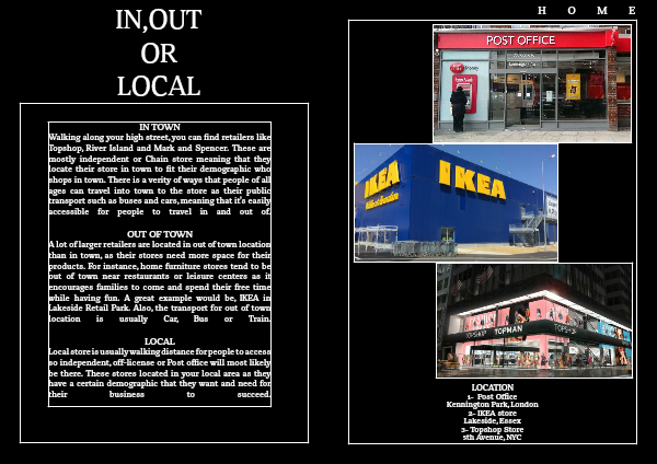 A lot of larger retailers are located in out of town location than in town, as their stores need more space for their products. For instance, home furniture stores tend to be out of town near restaurants or leisure centers as it encourages families to come and spend their free time while having fun. A great example would be, IKEA in Lakeside Retail Park. Also, the transport for out of town location is usually Car, Bus or Train.