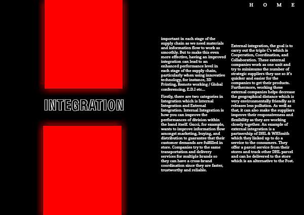 Firstly, there are two categories in Integration which is Internal Integration and External Integration. Internal Integration is how you can improve the performances of division within the band itself. Gucci, for example, wants to improve information flow amongst marketing, buying, and distribution to guarantee that their customer demands are fulfilled in store. Companies try to the same transportation and delivery services for multiple brands so they can have a cross-brand coordination since they are faster, trustworthy and reliable.