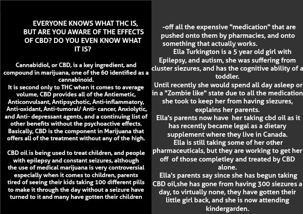 Ella's parents say since she has begun taking CBD oil,she has gone from having 300 siezures a day, to virtually none, they have gotten their little girl back, and she is now attending kindergarden.