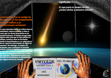 Lo que respondas indica tu actitud sobre la naturaleza, sobre la realidad, y sobre si crees que los dioses intervienen en los asuntos humanos. Si insistes en que hubo alguna razón para que el rayo partiese el templo, entonces vives en un mundo donde la incertidumbre es un subproducto de los caprichos emocionales de algún ser supremo. Sin embargo, si aceptas ese incidente como solamente un desastre natural, entonces también aceptas que en la vida hay ocurrencias azarosas. Tal punto de vista no excluye la noción de lo divino, por supuesto. Simplemente plantea que no todo en la naturaleza es administrado por alguna burocracia celestial.