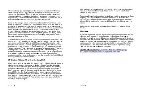 Not a year after I left the Southern Baptist church, my only brother died in a single-vehicle accident( unrelated to alcohol). People from the Wesleyan church and the Southern Baptist church brought my parents and me food, sympathy cards and hugs the day after my brother’ s death. Two weeks later, it started- some of the same people, who wore the face of kindness and affability the day they brought food, sympathy cards and hugs to my parents and me, began to say( to my face),“ Your brother died because he was a sinner.”“ God needed your brother more than you did.”“ Do you think your brother went to heaven?”“ Your brother could have gone to hell; he wasn’ t an avid churchgoer.”