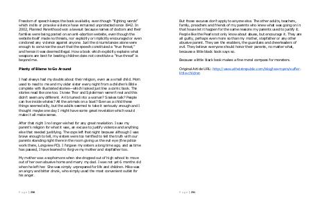 Freedom of speech keeps the book available, even though“ fighting words” which incite or provoke violence have remained unprotected since 1942. In 2002, Planned Parenthood won a lawsuit because names of doctors and their families were being posted on an anti-abortion website, even though the website itself made no threats, nor explicitly or implicitly encouraged or even condoned any violence against anyone. Just the circumstances alone were enough to convince the court that the speech constituted a“ true threat,” and hence it was deemed illegal. How a book which explicitly explains what weapons are best for beating children does not constitute a“ true threat” is beyond me.