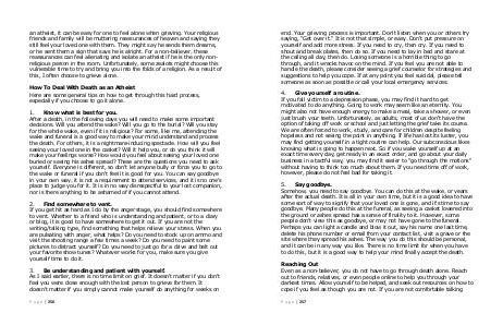 Reaching Out Even as a non-believer, you do not have to go through death alone. Reach out to friends, relatives, or even people online to help you through your darkest times. Allow yourself to be helped, and seek out resources on how to cope if you feel as though you are not. If you are not comfortable talking