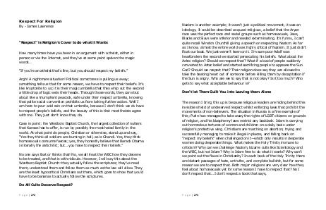 The reason I bring this up is because religious leaders are hiding behind this invisible shield of undeserved respect whilst enforcing laws that prohibit the movements of non-believers. The situation in Russia is a fine example of this; Putin has managed to take away the rights of LGBT citizens on grounds of religion, and his blasphemy laws restrict any backlash. Islam is carrying out horrendous tortures of women and children on a daily basis under religion’ s protective wing. Christians are marching on abortion, trying and successfully managing to make it illegal in places, and falling back on“ respect my beliefs” when challenged on it— which only results in desperate women doing desperate things. What makes the Holy Trinity immune to criticism? Why can we challenge Nazism, bizarre cults like Scientology and the WBC, but not Islam? Why is Islam free to do what it wants? Why can’ t we point out the flaws in Christianity? In each book of the Holy Trinity there are blatant passages of hate, untruths, and complete bullshit, but for some reason we are to respect that. Both major religions are very clear how they feel about homosexuals yet for some reason I have to respect that? No I don’ t respect that... I don’ t respect a book that says,