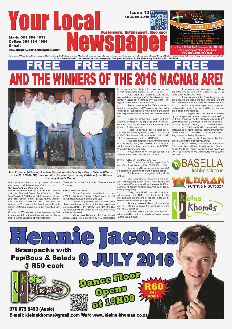 No part of Your Local Newspaper Rustenburg, Buffelspoort and Mooinooi may be reproduced without written consent of the publishers. The publishers accept no liability of any nature arising out of,