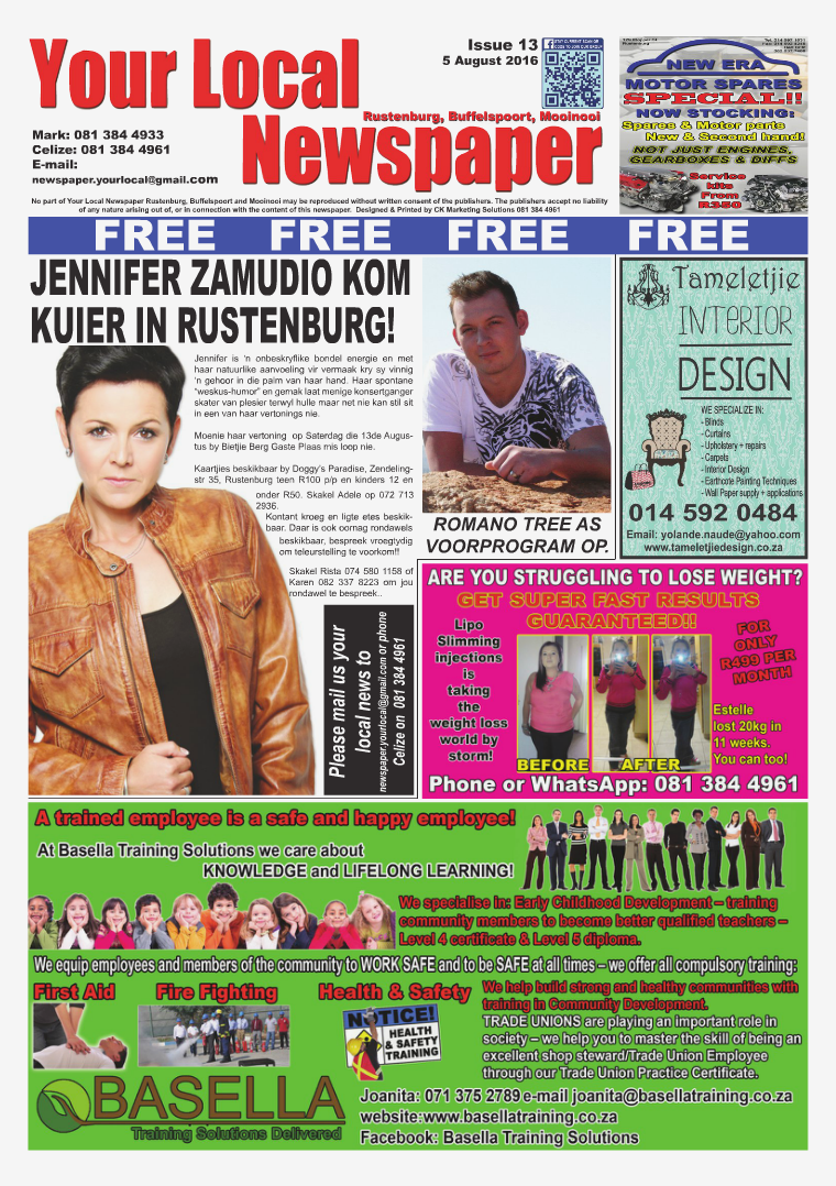 No part of Your Local Newspaper Rustenburg, Buffelspoort and Mooinooi may be reproduced without written consent of the publishers. The publishers accept no liability
