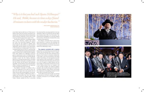 Rav Bender concluded his address with a story that happened to him when he was a fifteen-year-old yasom who had recently lost his father and was still reciting Kaddish . He was davening in Torah Vodaath in Williamsburg when in walked the Ponovezher Rav , who had yahrzeit and needed to serve as shaliach tzibbur . Young Yaakov Bender assisted the Rav in procuring the amud and then accompanied him to his next destination . When he told the Rav that his father had recently been niftar , the Ponovezher Rav embraced him and began to cry , his tears wetting the boy ’ s face . The Rav then showered his young companion with berachos .