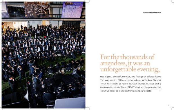 one of great simchah , emotion , and feelings of hakaras hatov . The long-awaited 50th anniversary dinner of Yeshiva Darchei Torah was a night of kavod haTorah , ahavas haTorah , and a testimony to the nitzchiyus of Klal Yisrael and the promise that