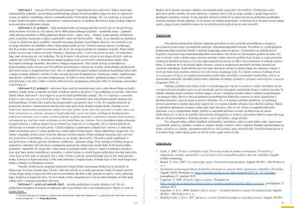 45 Učitelj u ulozi jest postupak u kojemu učitelj / učiteljica u isto vrijeme sudjeluje u dramskom zbivanju, ali i nadzire što se događa s učenicima. Njegova / njezina najvažnija uloga jest da i dalje bude učitelj koji skrbi o disciplini i učenju, ali da istodobno učenicima, kad su spremni, dade mogućnost iskazivanja i odlučivanja.( http:// www. hcdo. hr / knjiznica / strucni-clanci / ucitelj-u-ulozi /, pristupljeno 4. 8. 2019., N. Morgan i J. Saxton: Učitelj u ulozi, preveo V. Krušić).