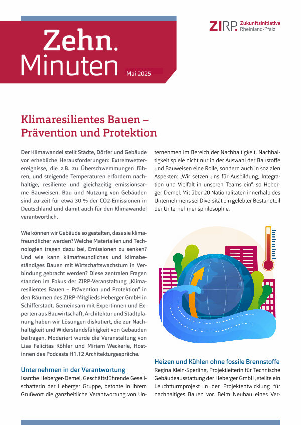 Wie können wir Gebäude so gestalten, dass sie klima- freundlicher werden? Welche Materialien und Technologien tragen dazu bei, Emissionen zu senken? Und wie kann klimafreundliches und klimabeständiges Bauen mit Wirtschaftswachstum in Verbindung gebracht werden? Diese zentralen Fragen standen im Fokus der ZIRP-Veranstaltung „ Klimaresilientes Bauen – Prävention und Protektion“ in den Räumen des ZIRP-Mitglieds Heberger GmbH in Schifferstadt. Gemeinsam mit Expertinnen und Experten aus Bauwirtschaft, Architektur und Stadtplanung haben wir Lösungen diskutiert, die zur Nachhaltigkeit und Widerstandsfähigkeit von Gebäuden beitragen. Moderiert wurde die Veranstaltung von Lisa Felicitas Köhler und Miriam Weckerle, Host- innen des Podcasts H1.12 Architekturgespräche.