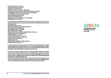 We have also to remember the valuable contribution of our members that supported the respective Boards in the organization of each event held in Bari and Lecce, spending their efforts as tutor of each seminar / conference session of ZEMCH 2015 and in particular to: Domenico Delle Foglie, Angelica Foscarini, Francesco Fusilli, Pietro Gigante, Stefania Marella, Loredana Modugno, Nicola Petruzzella, Angelamaria Quartulli, Giorgio Skoff, Maria Giuseppina Urgo. We have also to warmly thank the silent work of our secretariats which currently and patiently support our members, and this this time have been“ on loan” for the national and international guests: Emilia Antoniozzi, Giovanna Carbonara, Marco Iannone, Mara Bimbo, Laura Pieschi, Marco Quarta, Ivan Taurino.