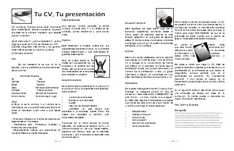 Este apartado es para saber cuál es tu formación académica; comienza desde el último grado de estudios. Escribe si eres titulado, pasante o en qué grado de estudios estas. Si tienes cursos, diplomados o talleres que tengan que ver con el puesto que solicitas En cuanto al diseño trata escríbelos, si no omítelos. que sea formal, coherente, con estructura y claro, no revuelvas Idiomas la información y no mezcles datos, entre más sencillo y Este rubro es tan destacado como la vacante que buscas, si no tienes algún nivel de idioma limpio es mejor. no lo pongas, si tu conocimiento es menos que básico no lo escribas. Si tienes alguna No pidas a nadie que haga tu CV, éste es certificación anota los puntos obtenidos y el personal además no sabrás que se escribió y no nombre de la certificación o sólo un grado identificarás en la entrevista de qué hablan al intermedio o básico, en porcentaje es muy preguntarte, aunque pienses que te lo difícil identificar si tienes el conocimiento o no. aprenderás de memoria. “El inconsciente traiciona”. Y muy simple al hacerlo tú, le transmites tu personalidad al documento y forma Habilidades parte de ti. Es la parte más egocéntrica del Currículum sin embargo no exageres porque en vez de En el siguiente artículo sabremos cómo llevar pensar en: “wow, este es EL CANDIDATO”, se una entrevista de trabajo con base en tu dirá: “mmm no creo, miente, el que sigue”. currículum. Si tienes dudas o requieres de En este caso escribe 5 habilidades que sepas mayor información escríbenos. que tienes las más comunes y que hablan de Psic. Arianna Quezada un perfil que encaja en todos lados son: • • • • • • Adaptabilidad Trabajo en equipo Compromiso Comunicación Solución de problemas Toma de decisión Bibliografía