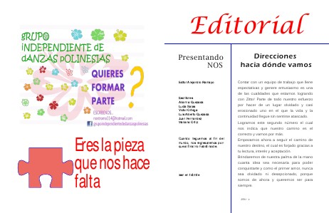 Contar con un equipo de trabajo que llene espectativas y genere entusiasmo es una de las cualidades que estamos logrando con Zitto! Parte de todo nuestro esfuerzo por hacer de un lugar olvidado y casi erosionado uno en el que la vida y la continuidad llegue sin sentirse atascado. Logramos este segundo número el cual nos indica que nuestro camino es el correcto y vamos por más. Empezamos ahora a seguir el camino de nuestro destino, el cual es forjado gracias a tu lectura, interés y aceptación. Brindaremos de nuestra palma de la mano cuanta idea sea necesaria para poder conquistarte y como el primer amor, nunca